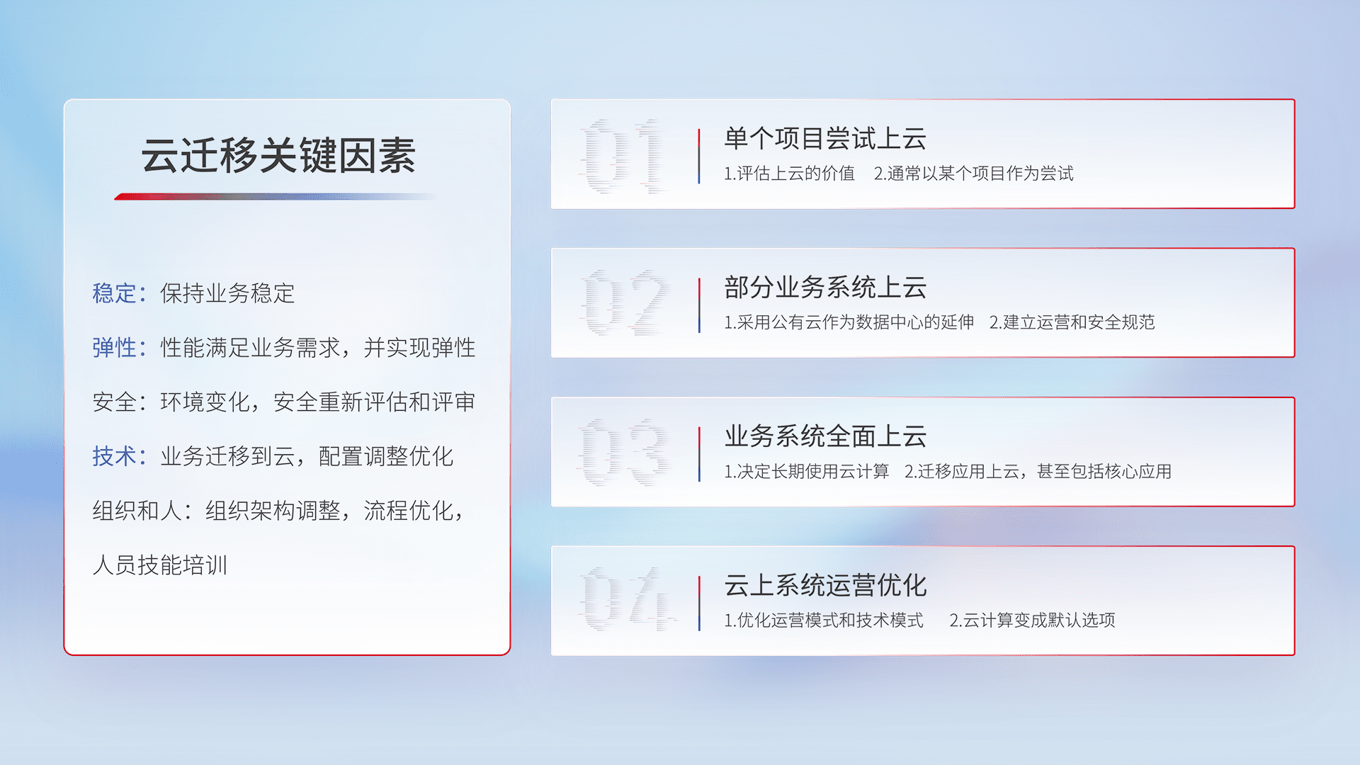 结合实际业务,,,从规划设计、、云平台选型、、、、云原生改造、、、、数据迁移、、、、集成交付,,,,迁移全过程为客户识别最佳上云路径,,做好风险识别管理,,设计网络架构、、、、身份权限、、、、安全审计合规、、、操作审计、、、日志审计、、、监控告警策略、、、、多站点容灾设计等,,,,对云上基础设施进行整体规划,,提升IT治理水平,,,以满足弹性、、、高可用、、高性能的需求。。。。