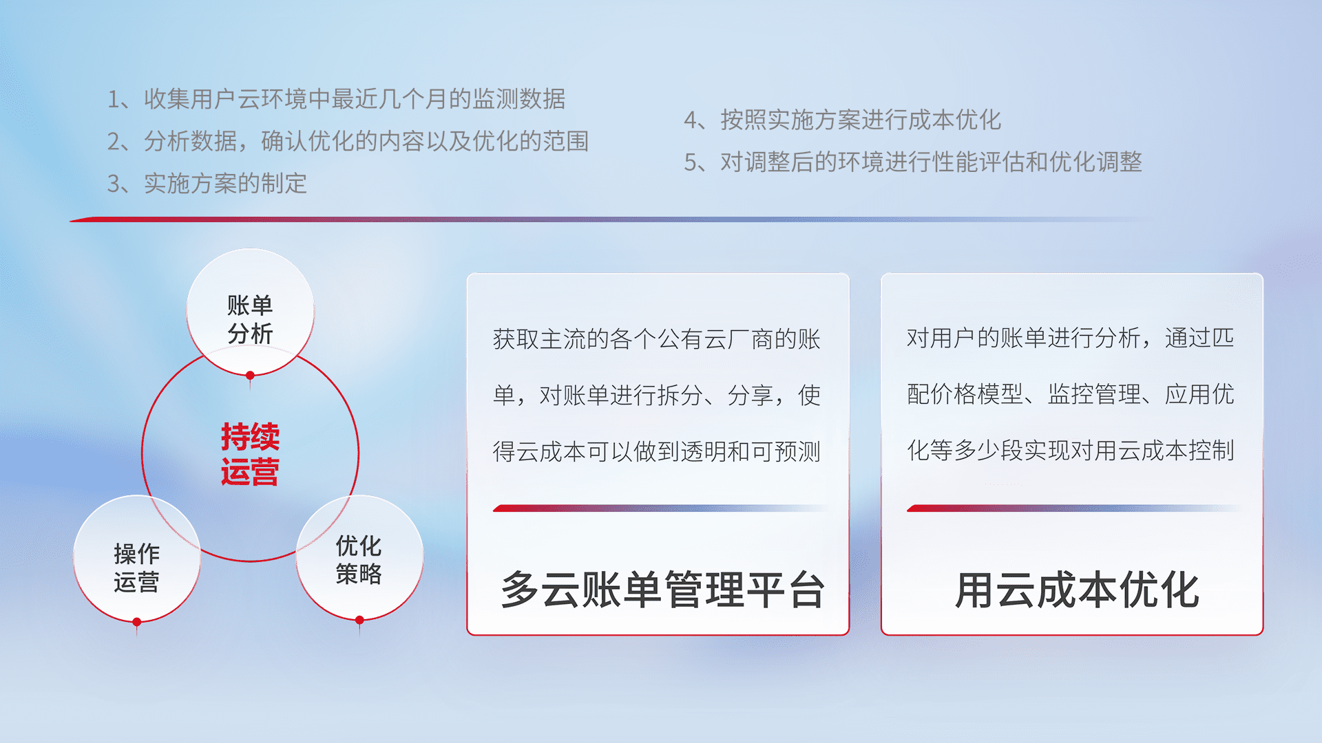 通过多云纳管,,,,以统一的资源数据模型把客户的云资源进行抽象和封装,,,进而实现对多云资源的统一操作,,,保障云资源管理的可靠性、、、、稳定性与可用性。。量身定制化运维内容,,,配置、、、、开发运维、、、补丁管理、、、备份、、监控、、认证和访问管理、、审计和日常巡检等,,,保障在用云过程中的可靠度,,,稳定度以及高可用率。。。